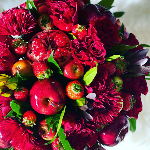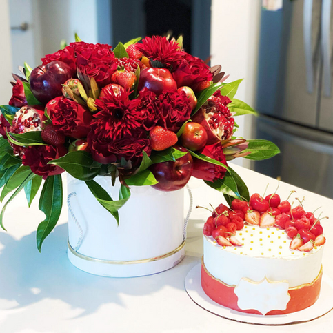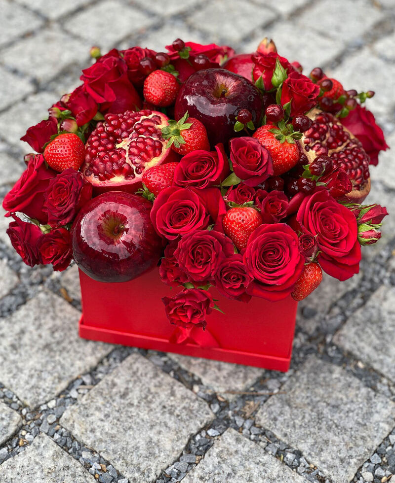 This lush flower arrangement features our most signature design. It has captivating shades of red, complimented with a unique touch of fresh fruits like pomegranates, apples and strawberries. This arrangement also includes Red Roses, Hypericum, Red Garden and Spray Roses. It’s a lovely gift fitting for any special occasion.